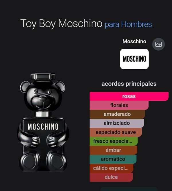 Toy Boy de Moschino es una fragancia de la familia olfativa Amaderada Especiada para Hombres. Toy Boy se lanzó en 2019. La Nariz detrás de esta fragrancia es Yann Vasnier. Las Notas de Salida son pimienta rosa, pera, nuez moscada de Indonesia, elemí y bergamota; las Notas de Corazón son rosa, clavo de olor, magnolia y lino; las Notas de Fondo son vetiver de Haití, cachemira, sándalo, Sylkolide y ámbar.