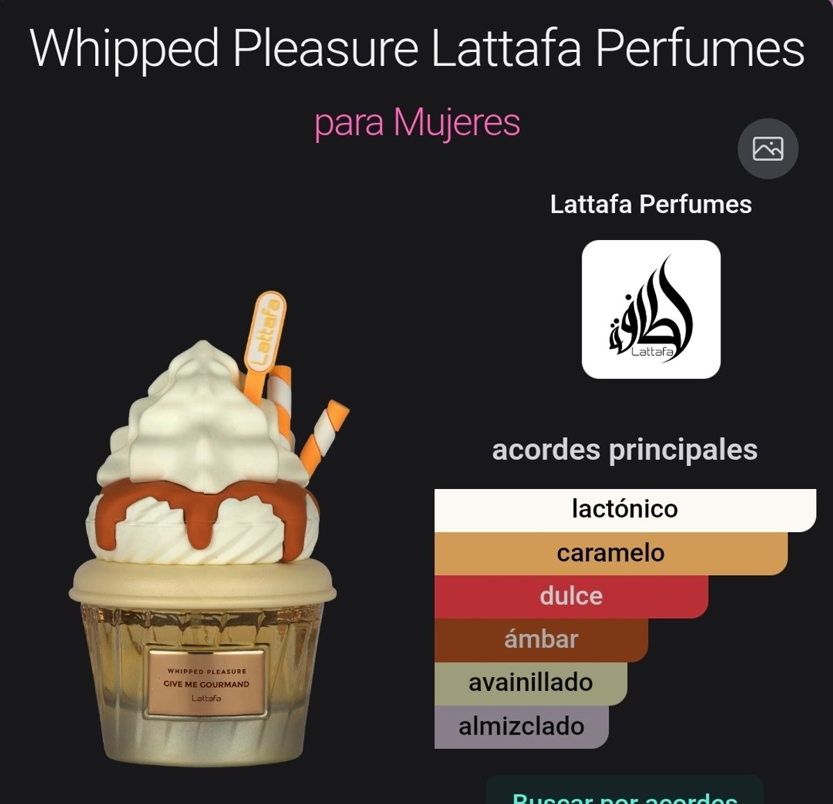 Whipped Pleasure de Lattafa Perfumes es una fragancia de la familia olfativa Oriental Vainilla para Mujeres. Esta fragrancia es nueva. Whipped Pleasure se lanzó en 2025. La Nariz detrás de esta fragrancia es Nisrine Bouazzaoui Grillié. Las Notas de Salida son caramelo, palomitas de maíz y Caramelo salado; las Notas de Corazón son leche y jazmín; las Notas de Fondo son haba tonka, almizcle y benjuí.